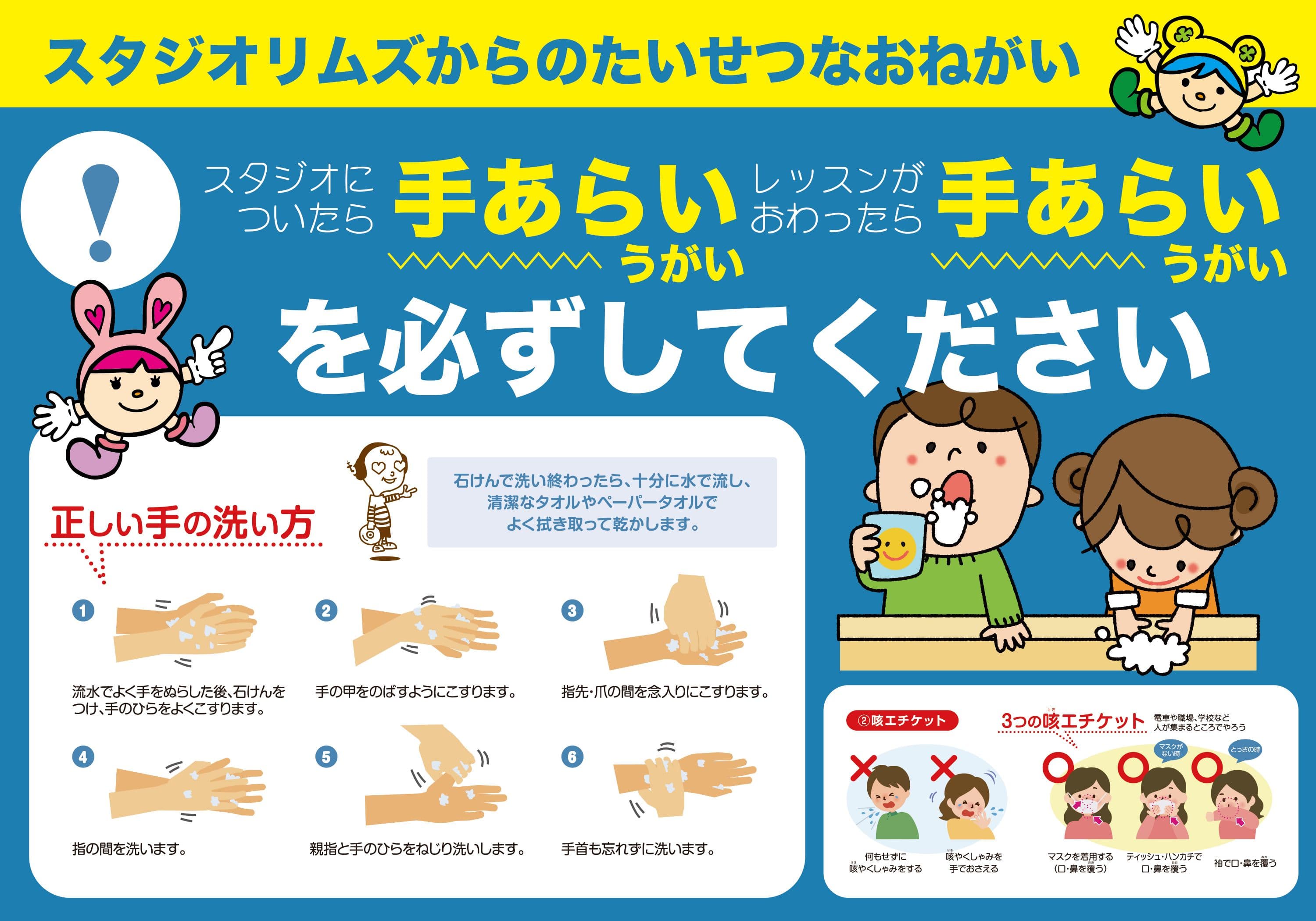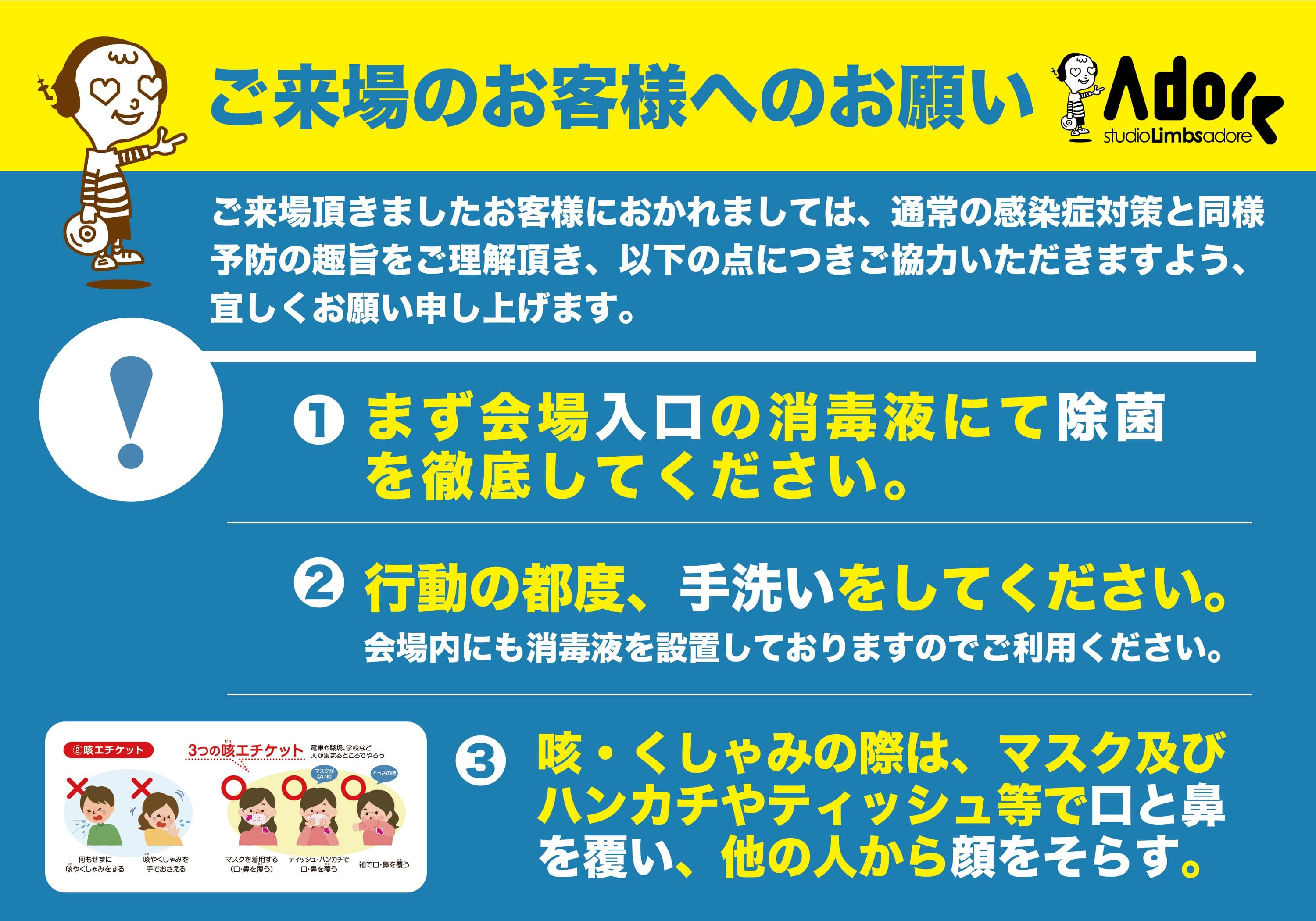 ※引き続きスタジオ内での徹底予防対策・徹底除菌を努めてまいりますので、各ご家庭での日頃の予防対策の徹底のご協力をお願いいたします。