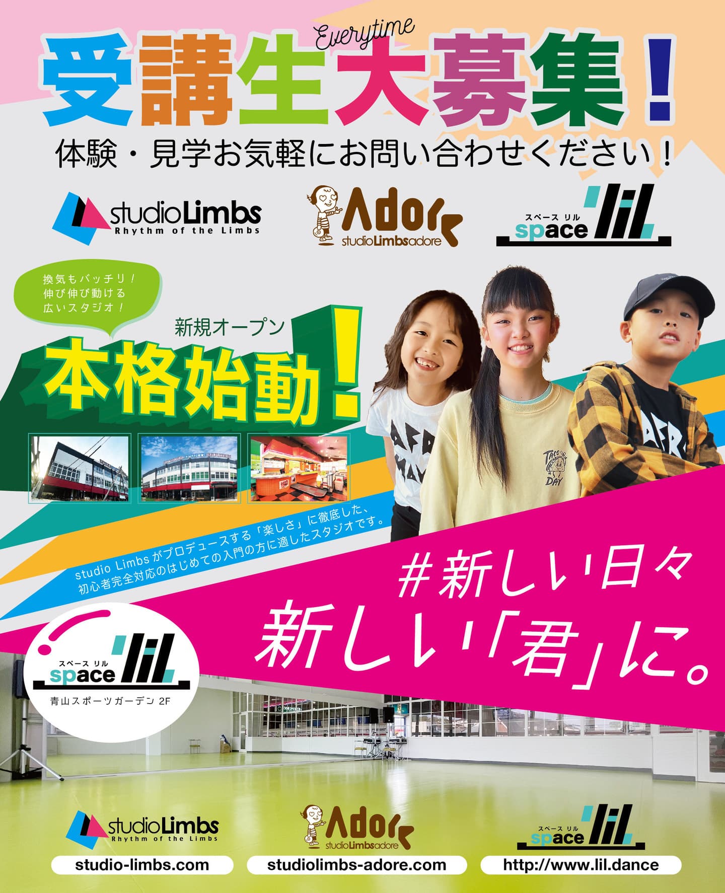 リニューアルに際しまして、姫路校のみ屋号をstudio Limbs -adore- (スタジオ リムズ アドア)とし、ダンスカリキュラム以外の各種ワークショップやイベントにも注力し、Love以上の愛をもって創造し、こだわりを邁進できるような環境創りに努め、皆様に愛され続けるような場所になればと願っております。